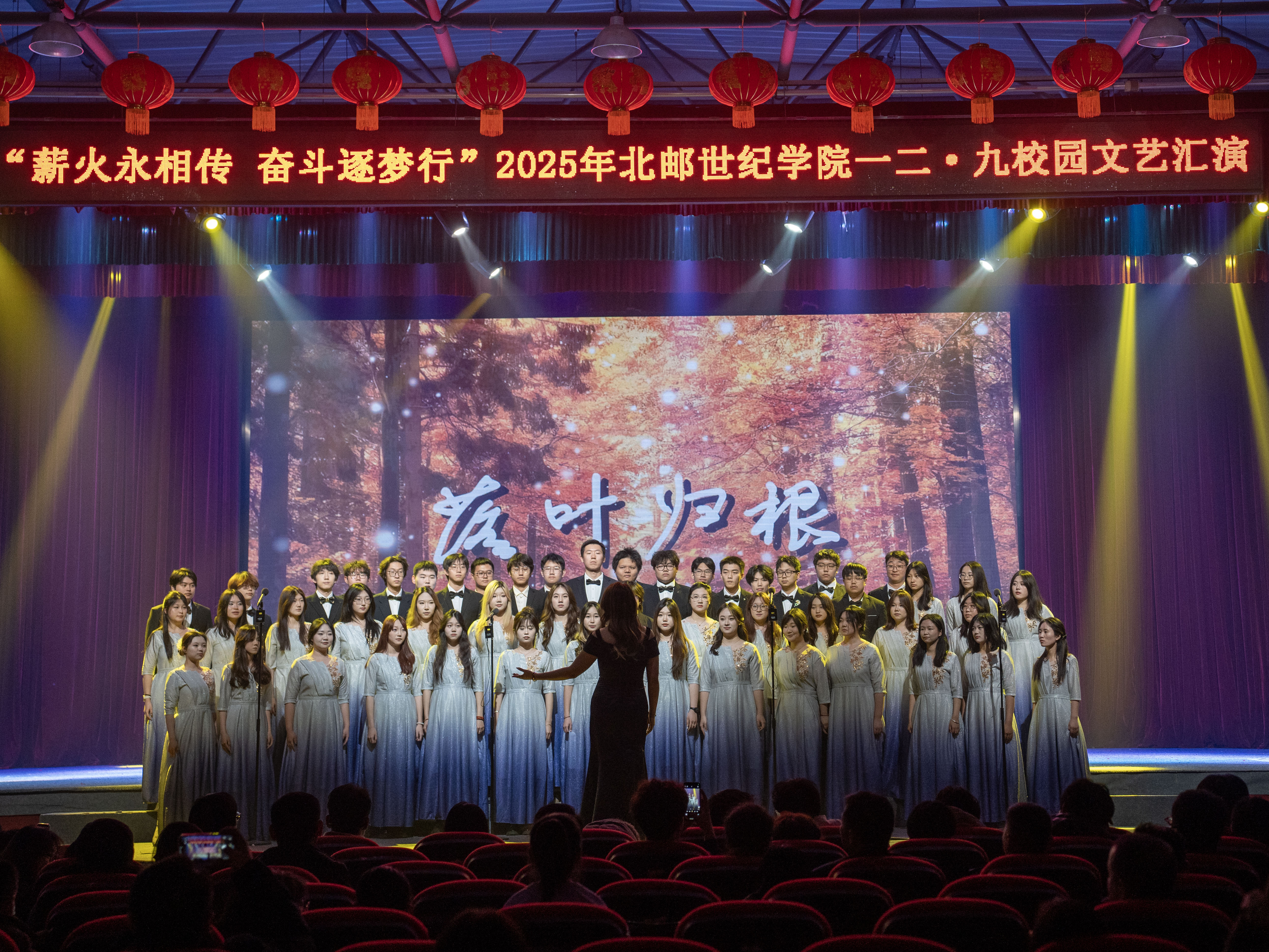 第二篇章“奋斗逐梦行” 展现新时代青年担当。经济管理系情景剧《大地诗行与未来交响:辛家堡的双重奏》,讲述青年扎根基层的奉献故事;大学生艺术团舞蹈队《彩云之南》《绿光》尽显青春灵动;自动化系武术《武韵》刚劲有力,彰显少年意气;外语系《紫金花盛开》、计算机科学与技术系《我的未来不是梦》将个人理想与时代脉搏相连;大学生艺术团合唱团以《落叶归根》《红旗飘飘》收尾,悠扬旋律让爱国与奋斗的主题深入人心。